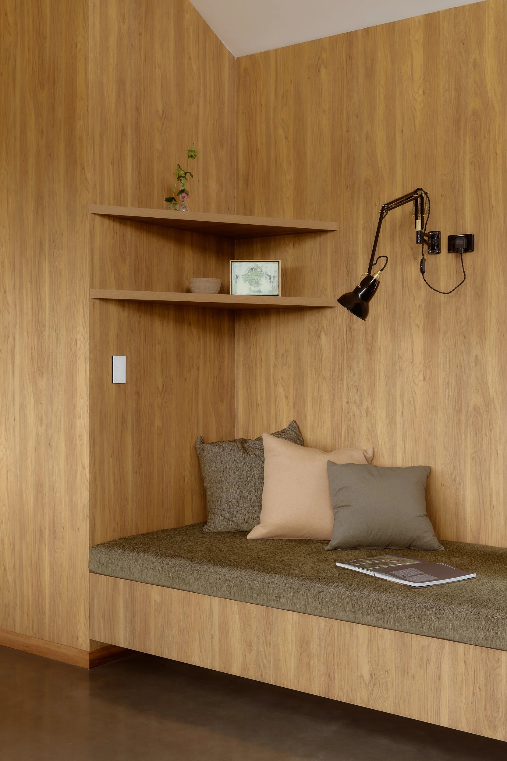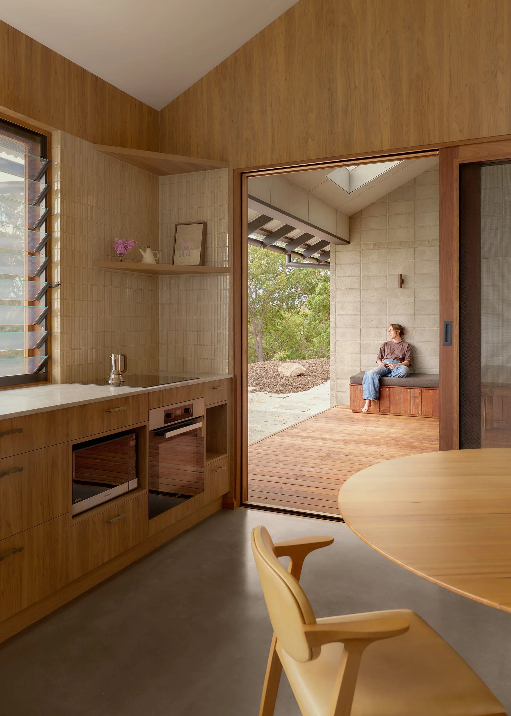 Timber window placements are considered, framing views but not exploiting them. The living space employs a bank of timber windows with mullions dissecting the escarpment like a diptych.