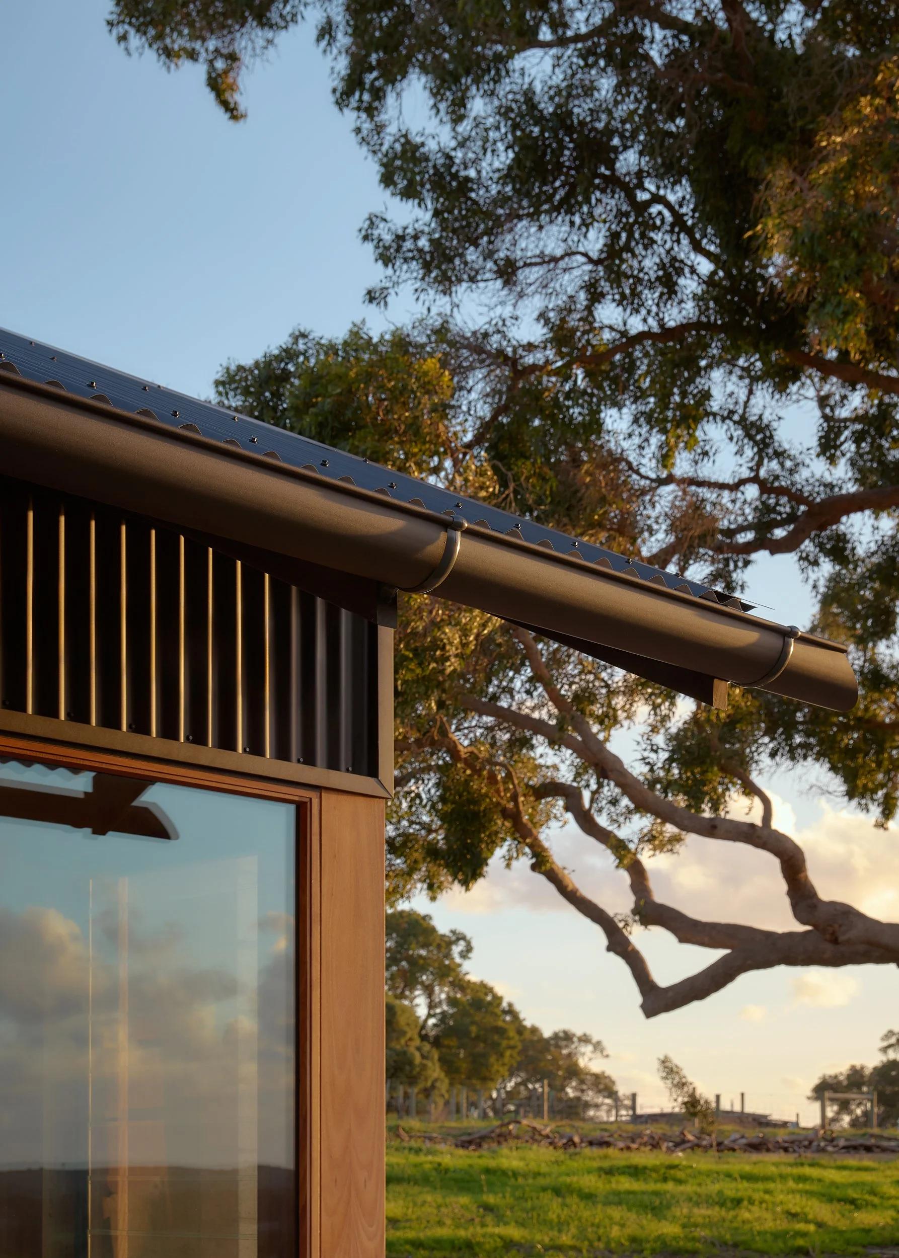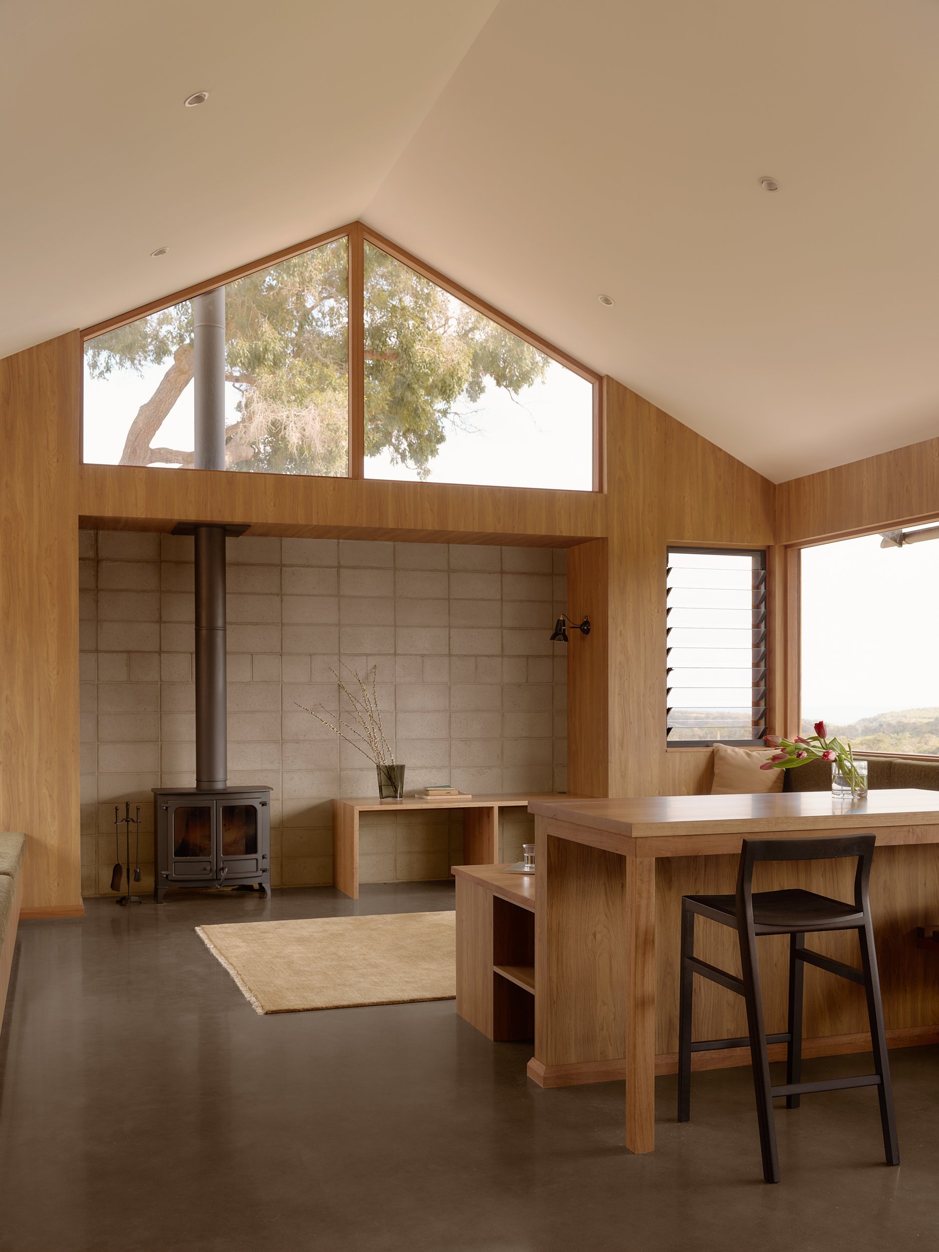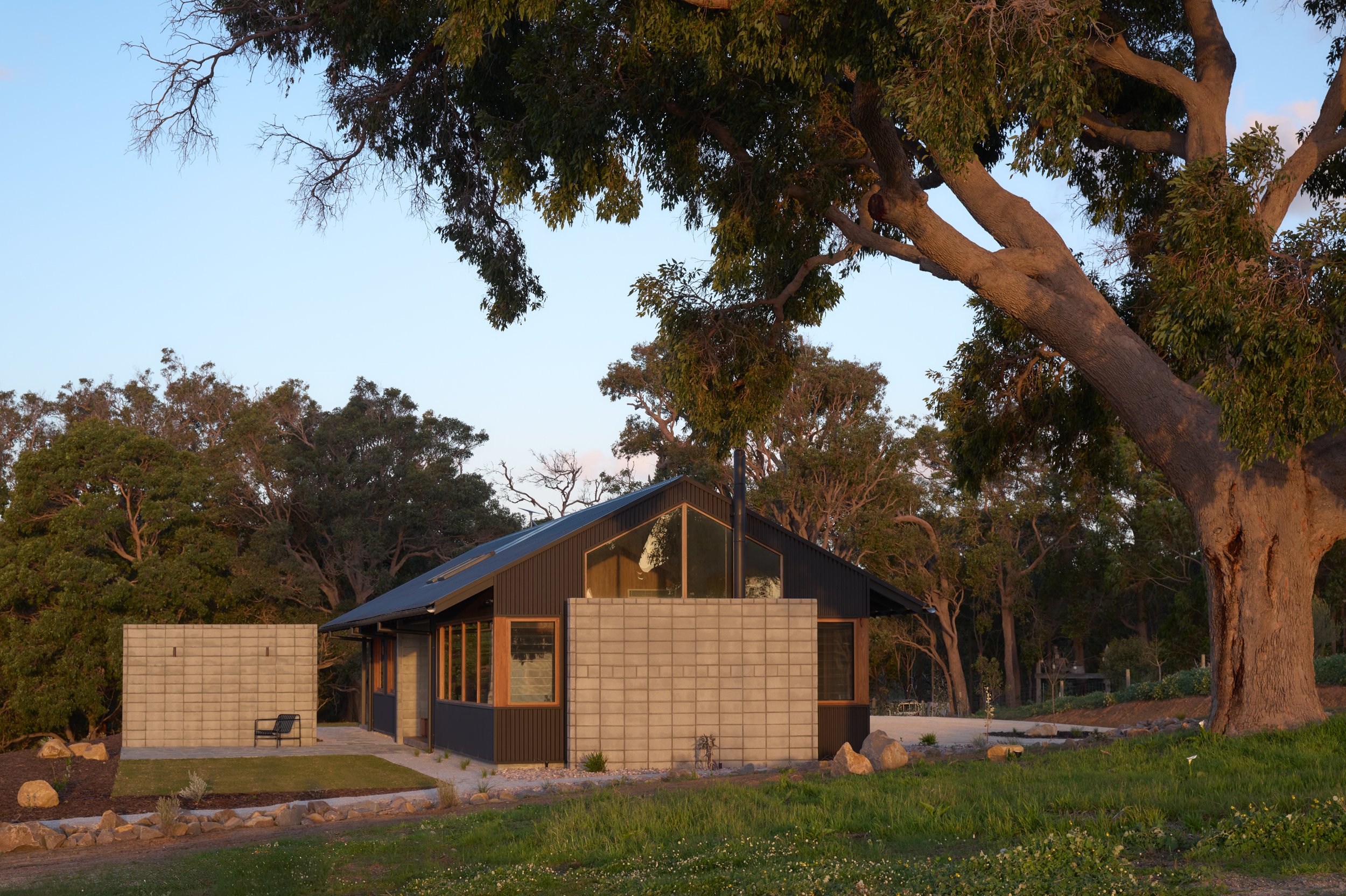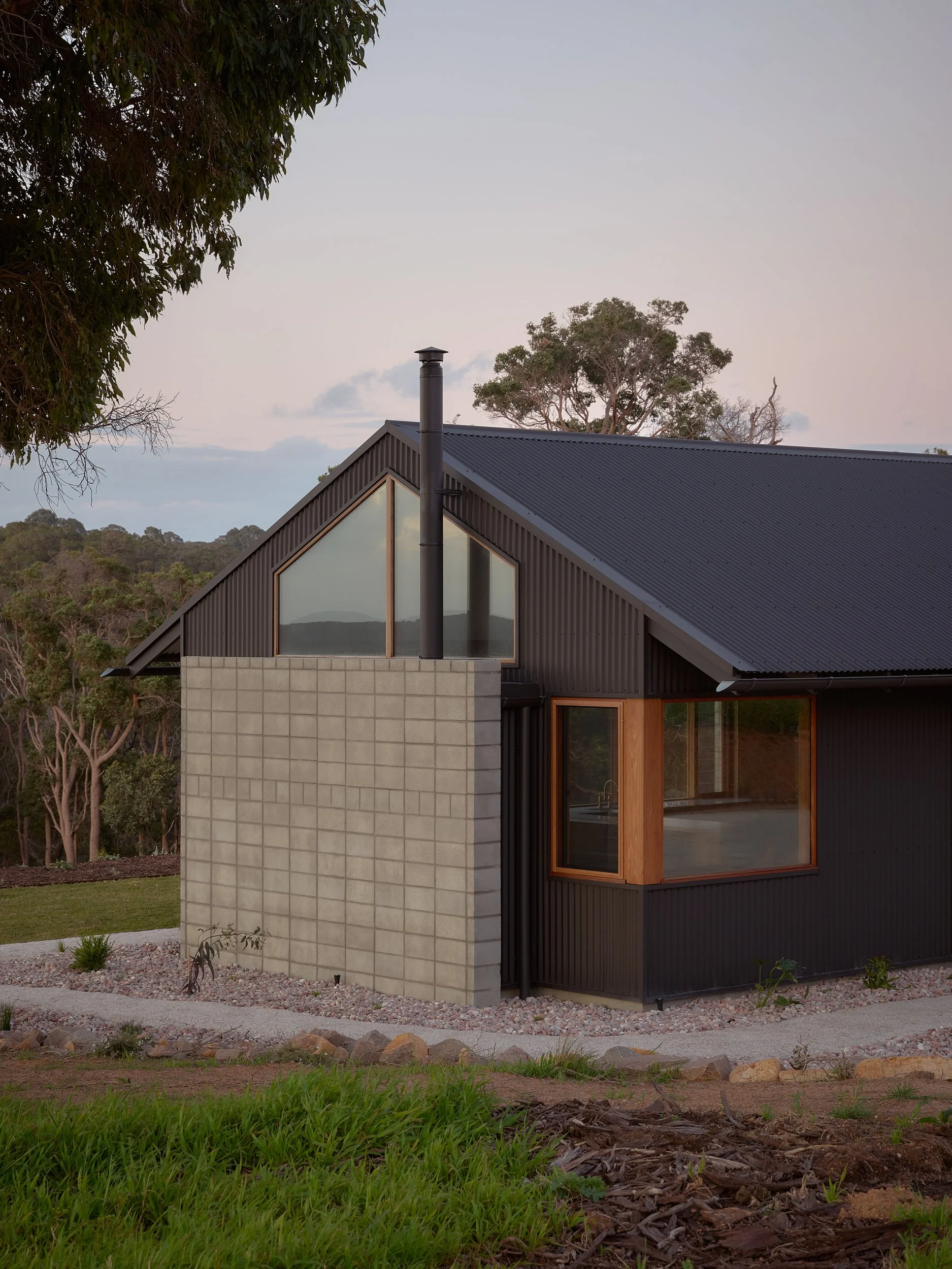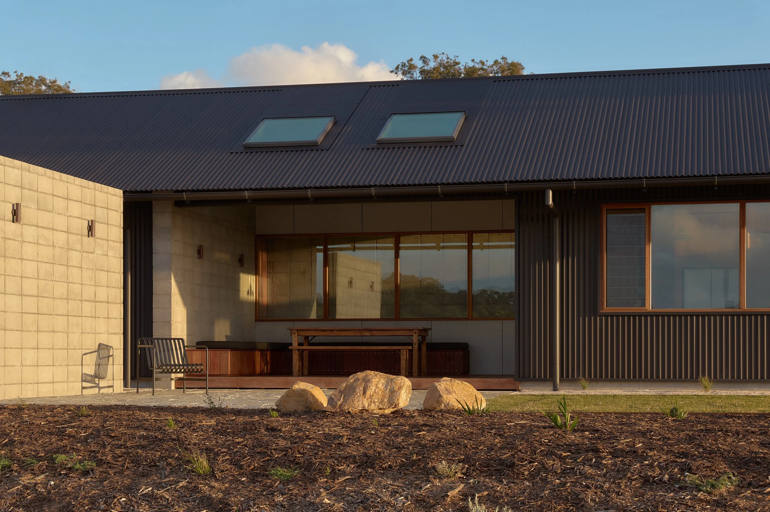The 3 bedroom, 2 bathroom home is anchored by blades of concrete, with timber and steel used for contrasting levity. The two concrete blades run perpendicular and converge in a 3 sided protected outdoor space cut into the floor plan, to encourage integration of the verandah into the home, prioritising and lengthening it's use throughout the year. One concrete blade protrudes North out to landscape; the lone wall and stone underfoot suggests a room with as little interventions as possible. Eaves are un-lined and the gutter dropped down with chamfered edges, celebrating water collection. Rains become a welcomed theatrical experience as you watch the droplets descend.