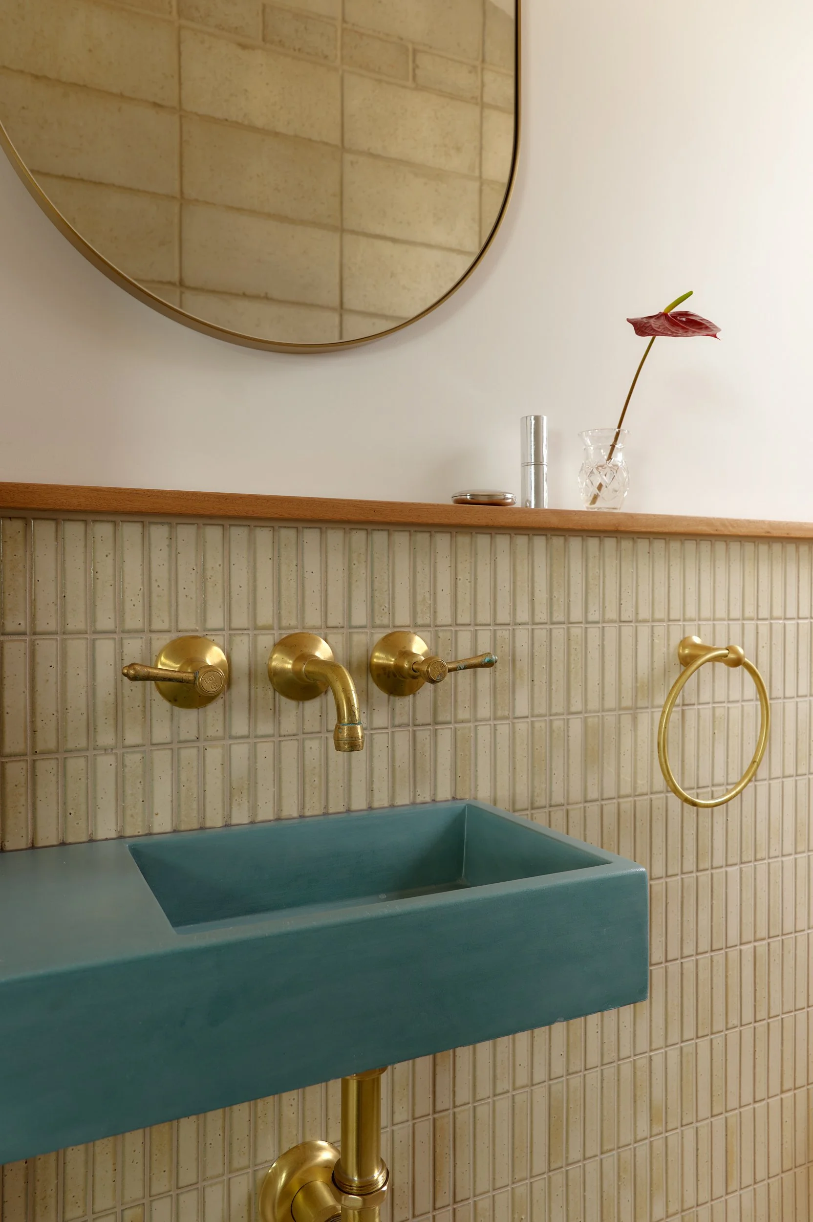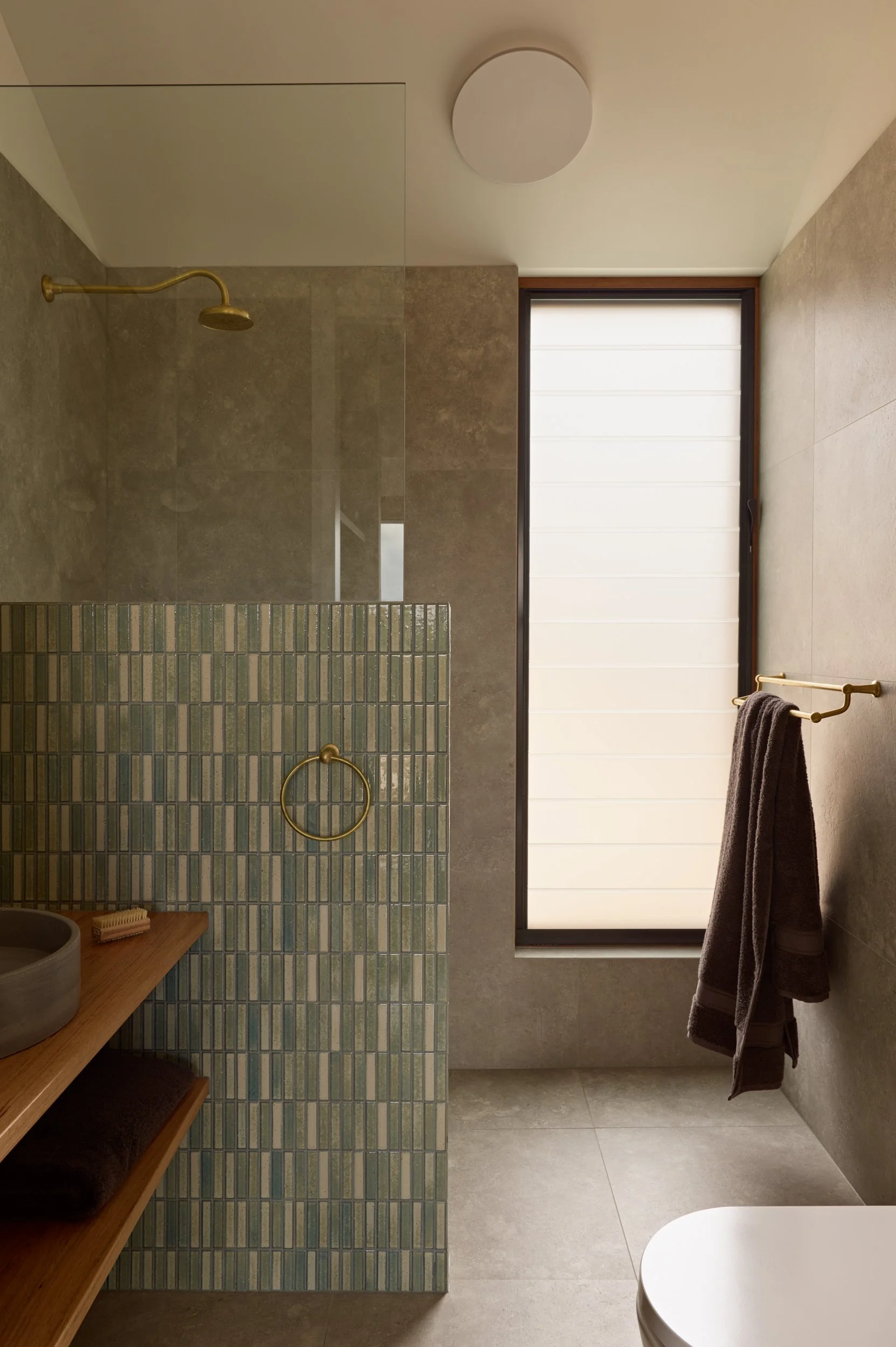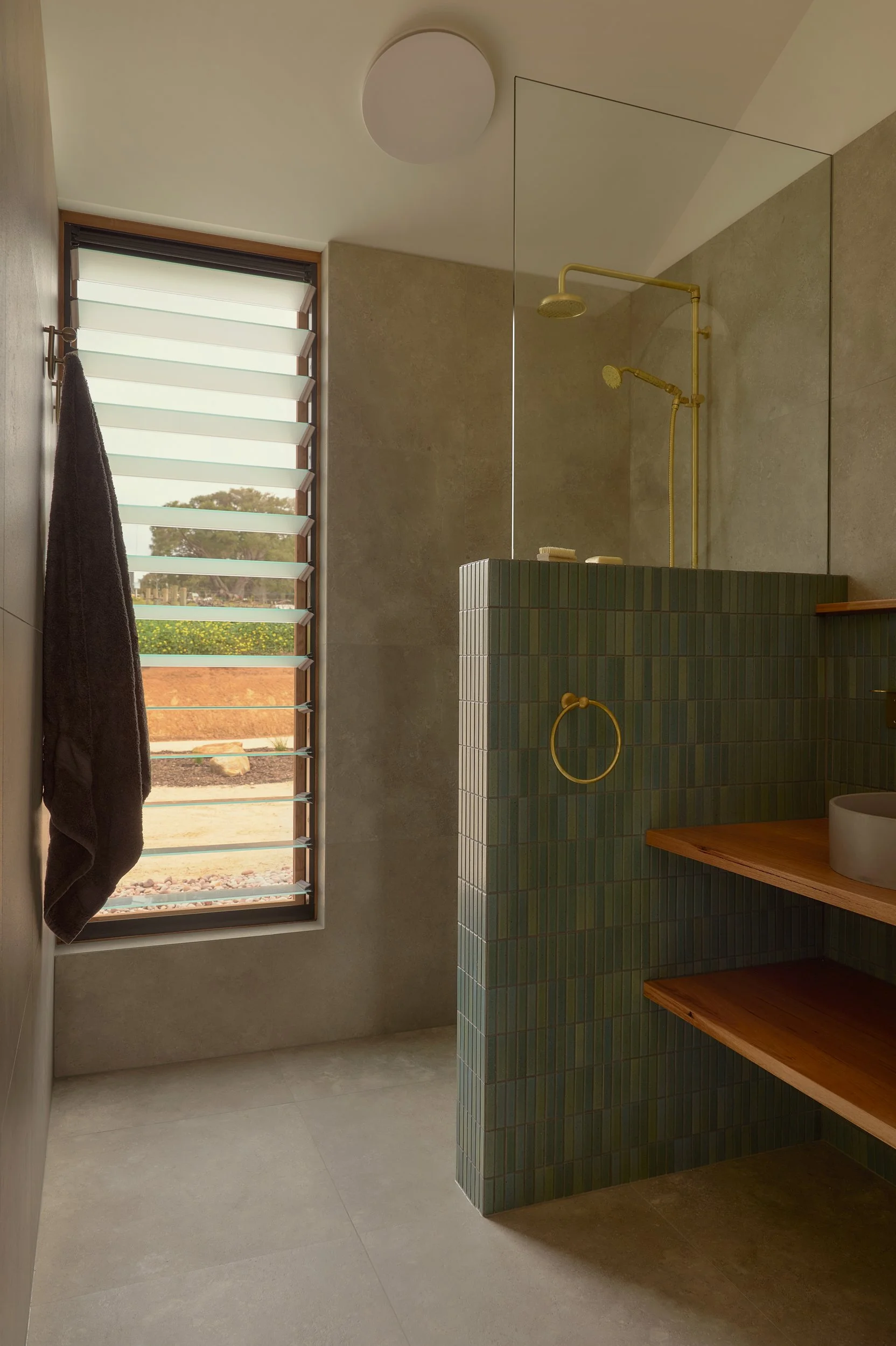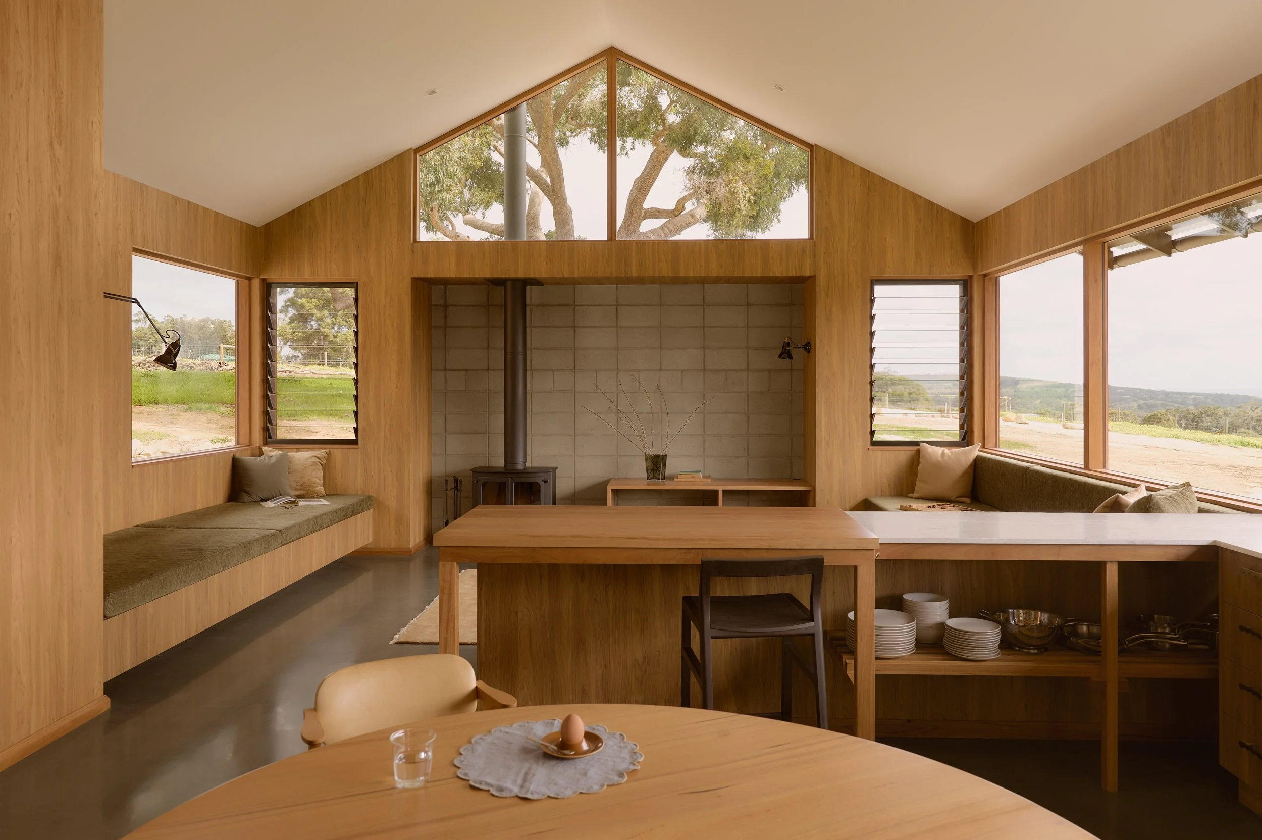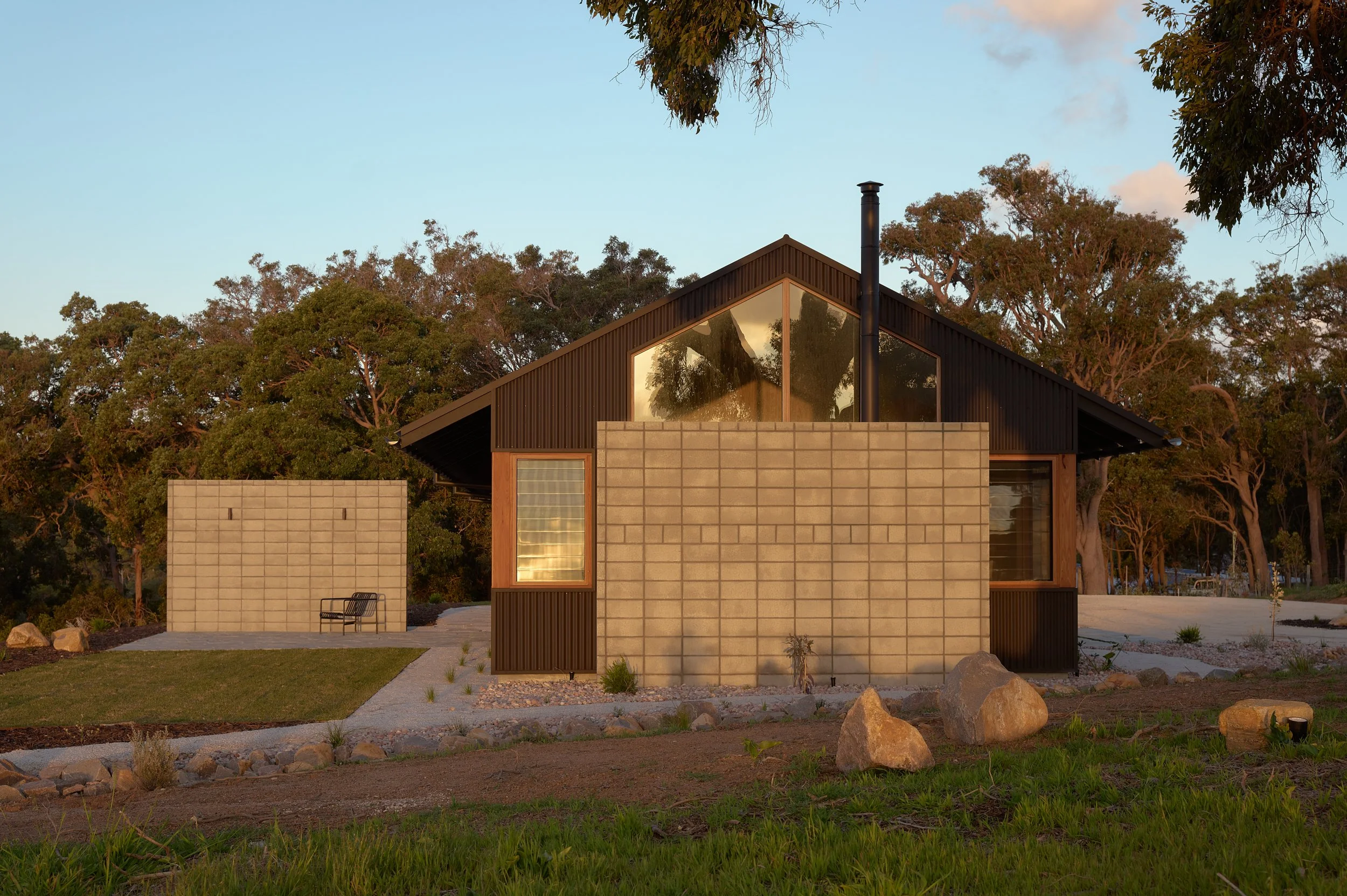 The 3 bedroom, 2 bathroom home is anchored by blades of concrete, with timber and steel used for contrasting levity. The two concrete blades run perpendicular and converge in a 3 sided protected outdoor space cut into the floor plan, to encourage integration of the verandah into the home, prioritising and lengthening it's use throughout the year. One concrete blade protrudes North out to landscape; the lone wall and stone underfoot suggests a room with as little interventions as possible. Eaves are un-lined and the gutter dropped down with chamfered edges, celebrating water collection. Rains become a welcomed theatrical experience as you watch the droplets descend.